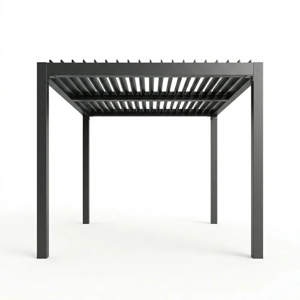 Questo gazebo da giardino ha una struttura in acciaio verniciato a polvere con tetto lamellare regolabile per protezione dal sole. Le dimensioni complessive sono 300 cm(lunghezza) x 300 cm(larghezza) x 240cm(altezza). Peso totale è di 60 kg.